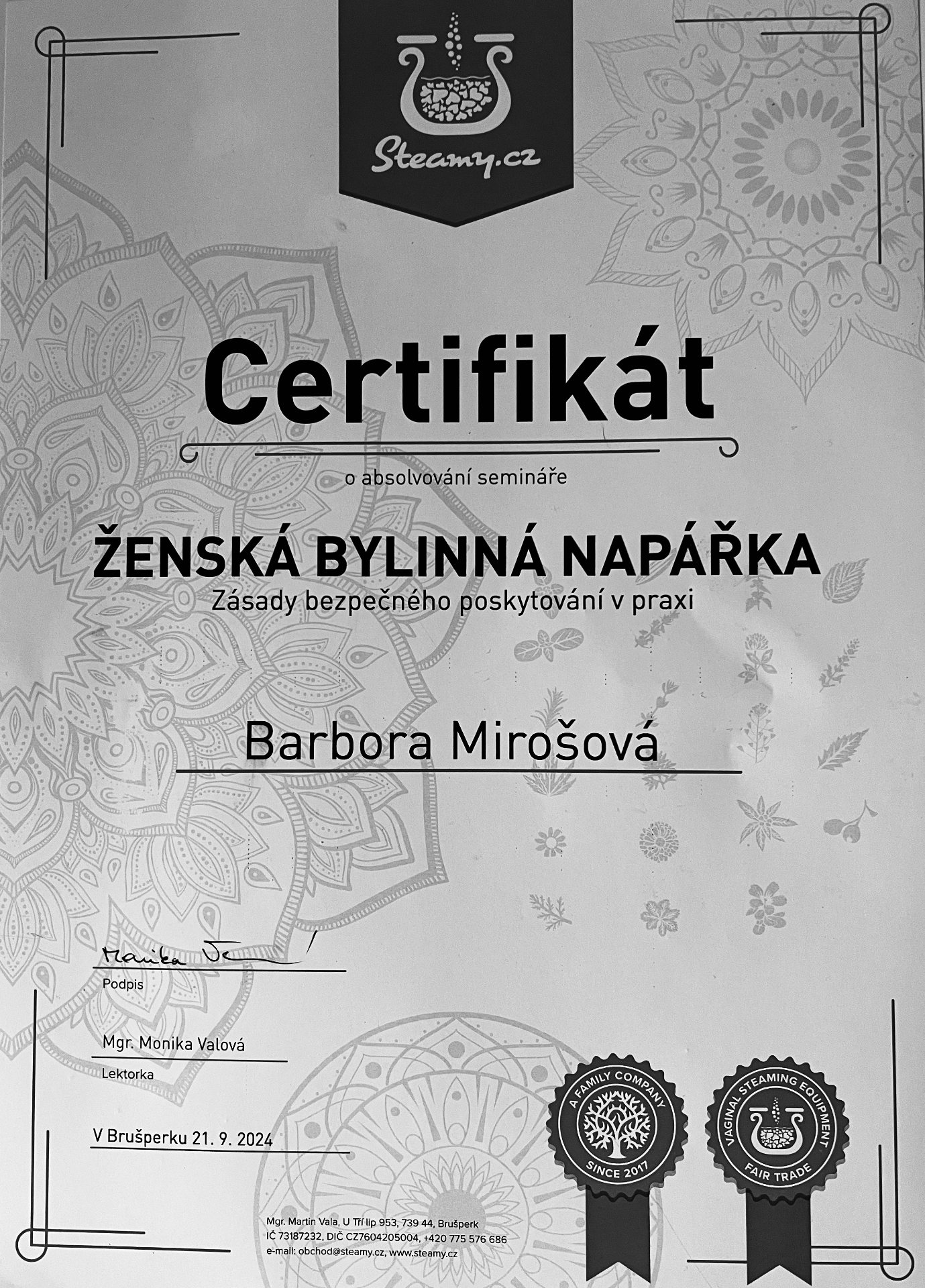 Věřím v propojení přírody a ženské energie, a proto se specializuji na ženskou bylinnou napářku, která je jemným, ale silným nástrojem pro regeneraci těla a duše. Každá žena je jedinečná, a proto k ní přistupuji individuálně – navrhuji bylinné směsi a procedury na míru, které podporují její zdraví, rovnováhu a vnitřní krásu.